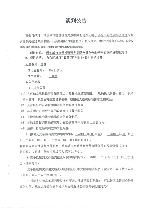 雅安城市建設(shè)投資開(kāi)發(fā)有限公司辦公電子設(shè)備及耗材采購(gòu)項(xiàng)目——競(jìng)爭(zhēng)性談判公告