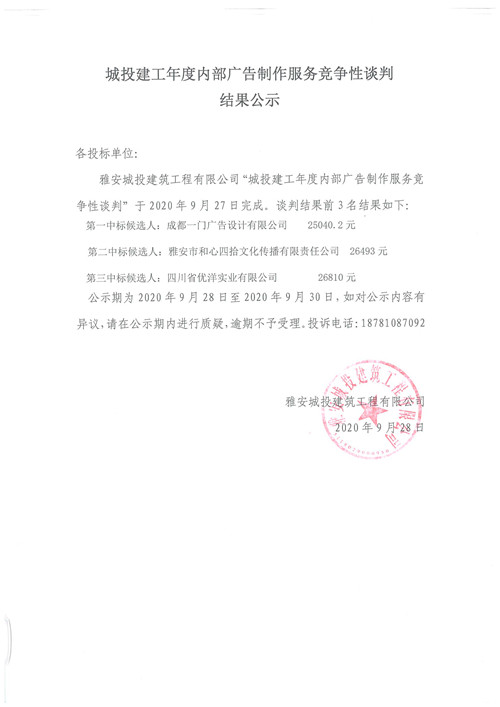 城投建工年度內(nèi)部廣告制作服務(wù)競(jìng)爭(zhēng)性談判結(jié)果公示