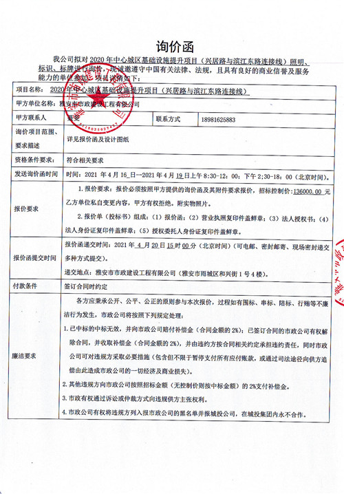 雅安市政公司2020年中心城區(qū)基礎(chǔ)設(shè)施提升項目(興居路與濱江東路連接線)照明、標(biāo)識、標(biāo)牌詢價函