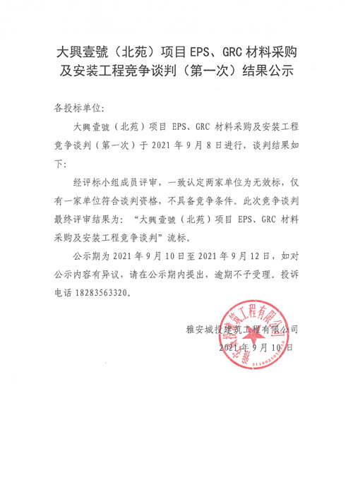 大興壹號(北苑)項目EPS、GRC材料采購及安裝工程競爭談判結(jié)果公示