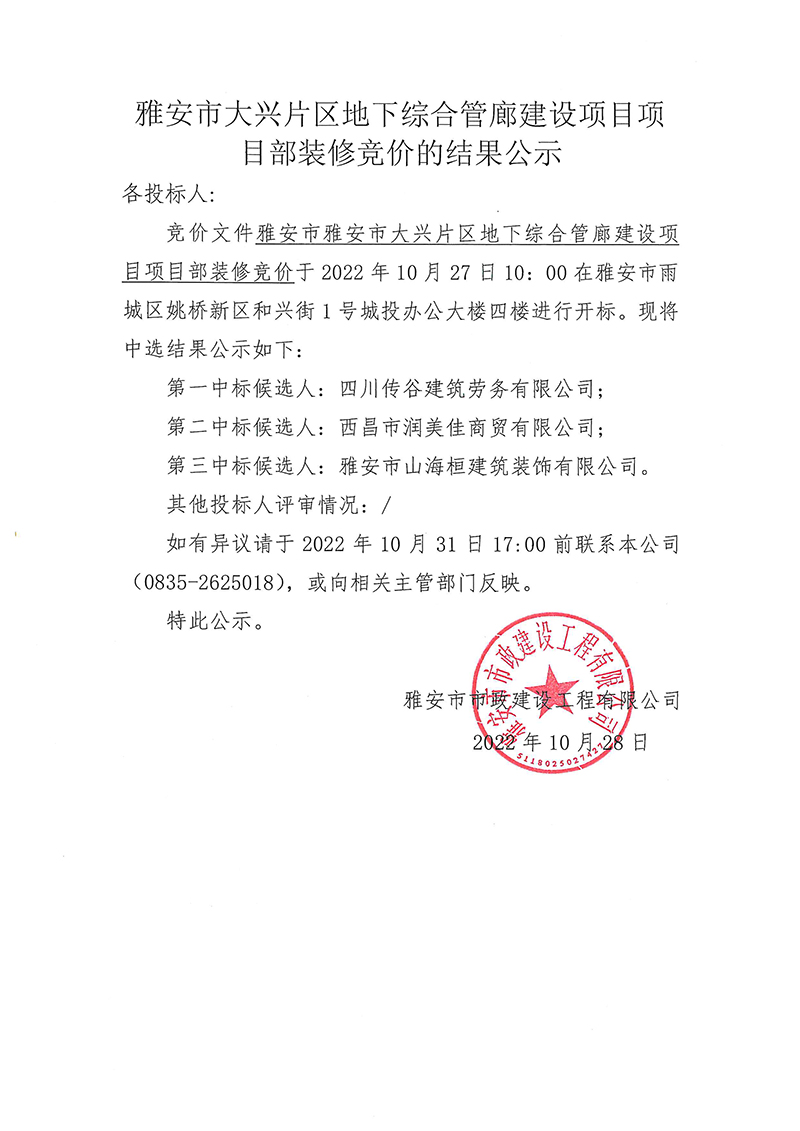 雅安市大興片區(qū)地下綜合管廊建設(shè)項(xiàng)目項(xiàng)目部裝修競價的結(jié)果公示