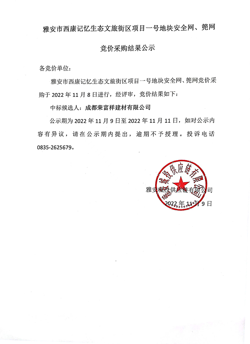 雅安市西康記憶生態(tài)文旅街區(qū)項(xiàng)目一號地塊安全網(wǎng)、篼網(wǎng)材料采購競價(jià)結(jié)果公示