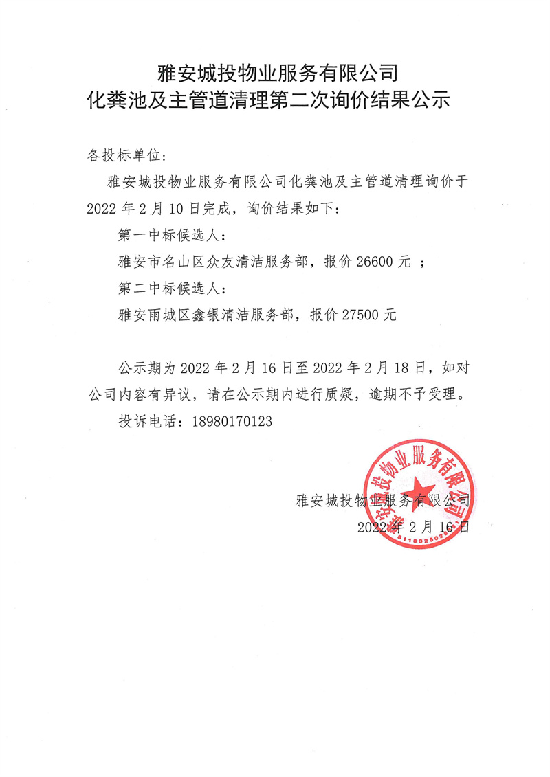 雅安城投物業(yè)服務(wù)有限公司化糞池及主管道清理詢價結(jié)果公示