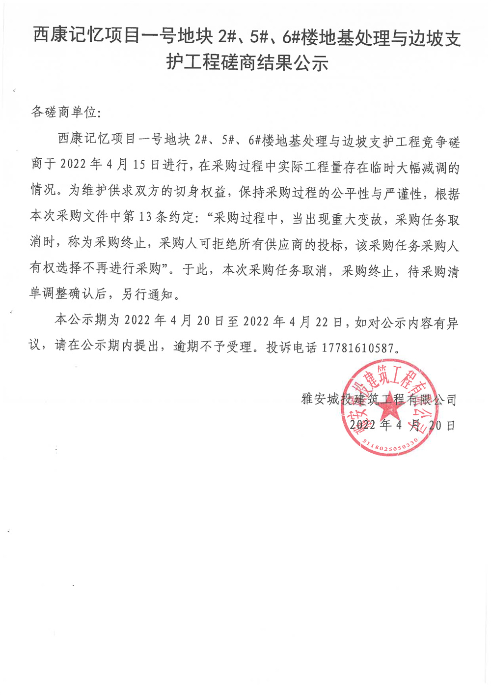 西康記憶項(xiàng)目一號(hào)地塊2#、5#、6#樓地基處理與邊坡支護(hù)工程磋商結(jié)果公示