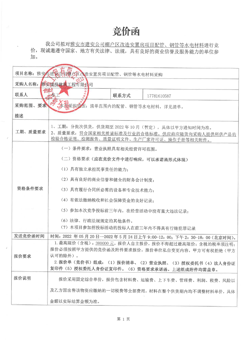 雅安市建安公司棚戶區(qū)改造安置房項(xiàng)目配管、鋼管等水電材料競價(jià)函