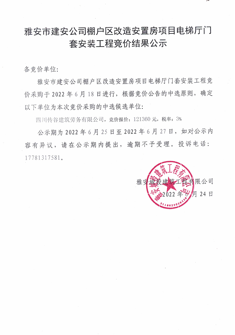 雅安市建安公司棚戶區(qū)改造安置房項(xiàng)目項(xiàng)目電梯廳門套安裝工程競價(jià)結(jié)果公示