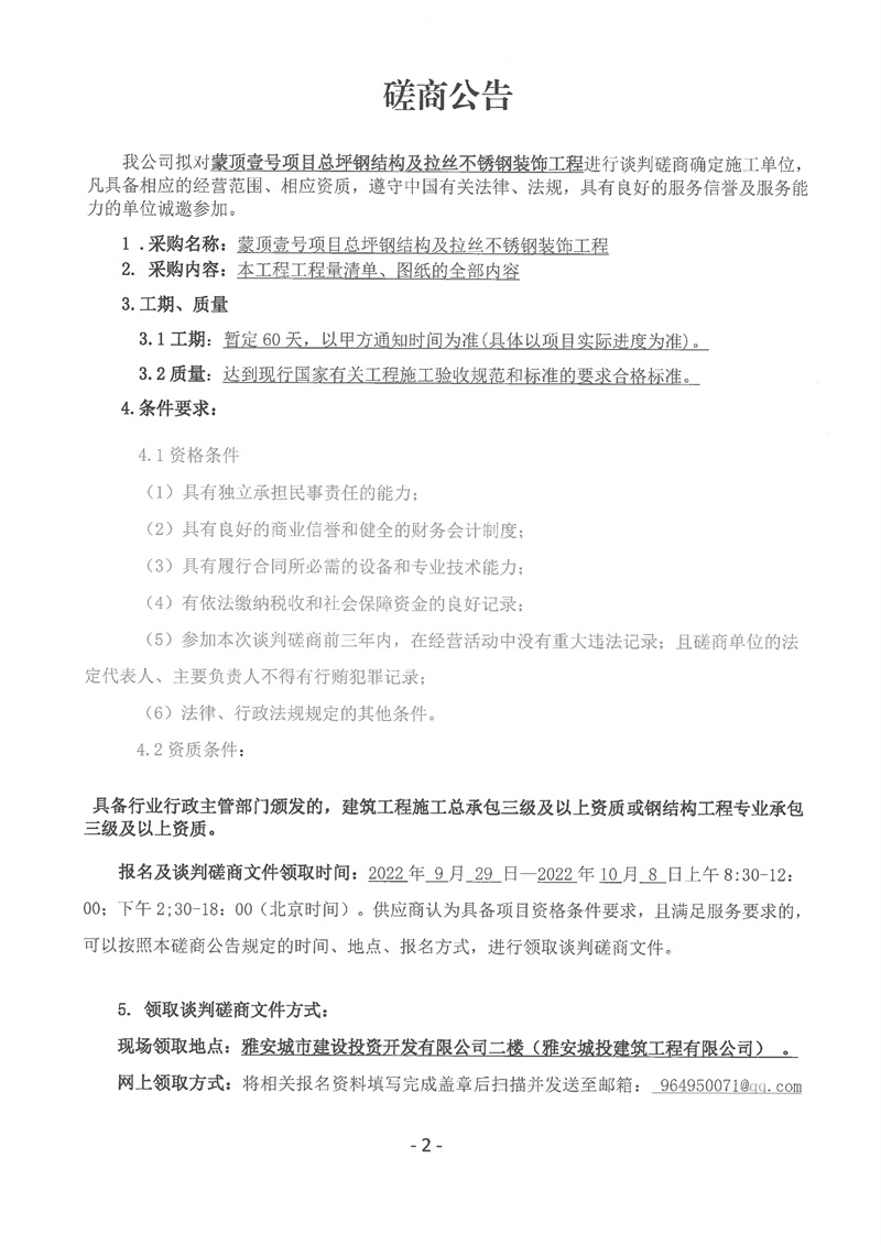 蒙頂壹號項(xiàng)目總坪鋼結(jié)構(gòu)及拉絲不銹鋼裝飾工程談判磋商公告
