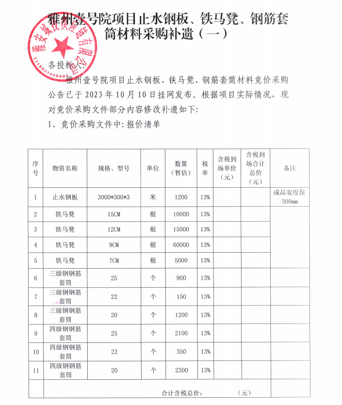 雅州壹號院項目止水鋼板、鐵馬凳、鋼筋套筒材料采購補(bǔ)遺(一)