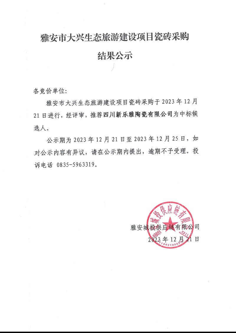 雅安市大興生態(tài)旅游建設(shè)項目瓷磚采購結(jié)果公示