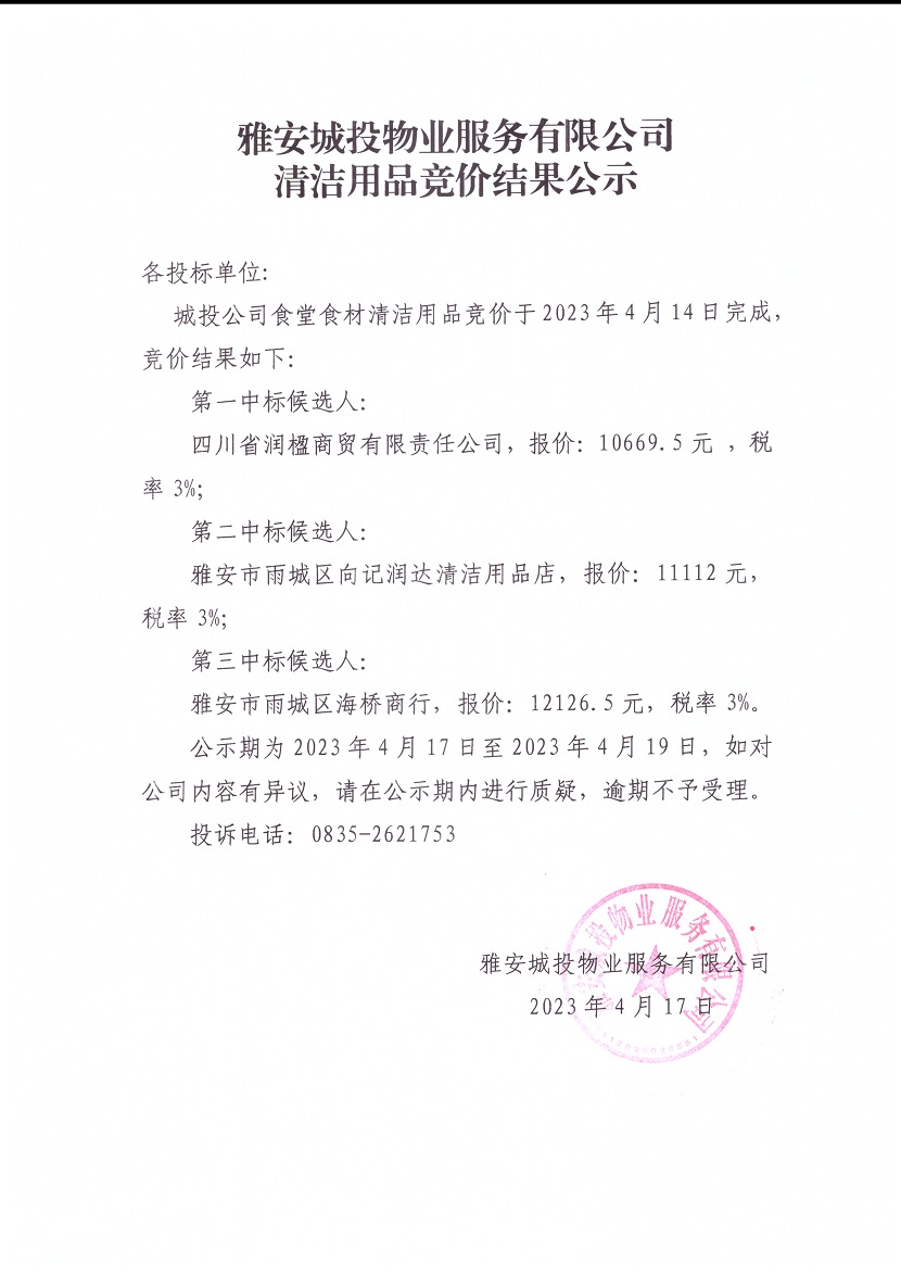 雅安城投物業(yè)服務(wù)有限公司清潔用品競(jìng)價(jià)結(jié)果公示