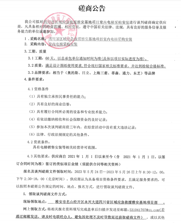 四川省區(qū)域應(yīng)急救援雅安基地項(xiàng)目室內(nèi)電梯采購(gòu)安裝談判磋商公告