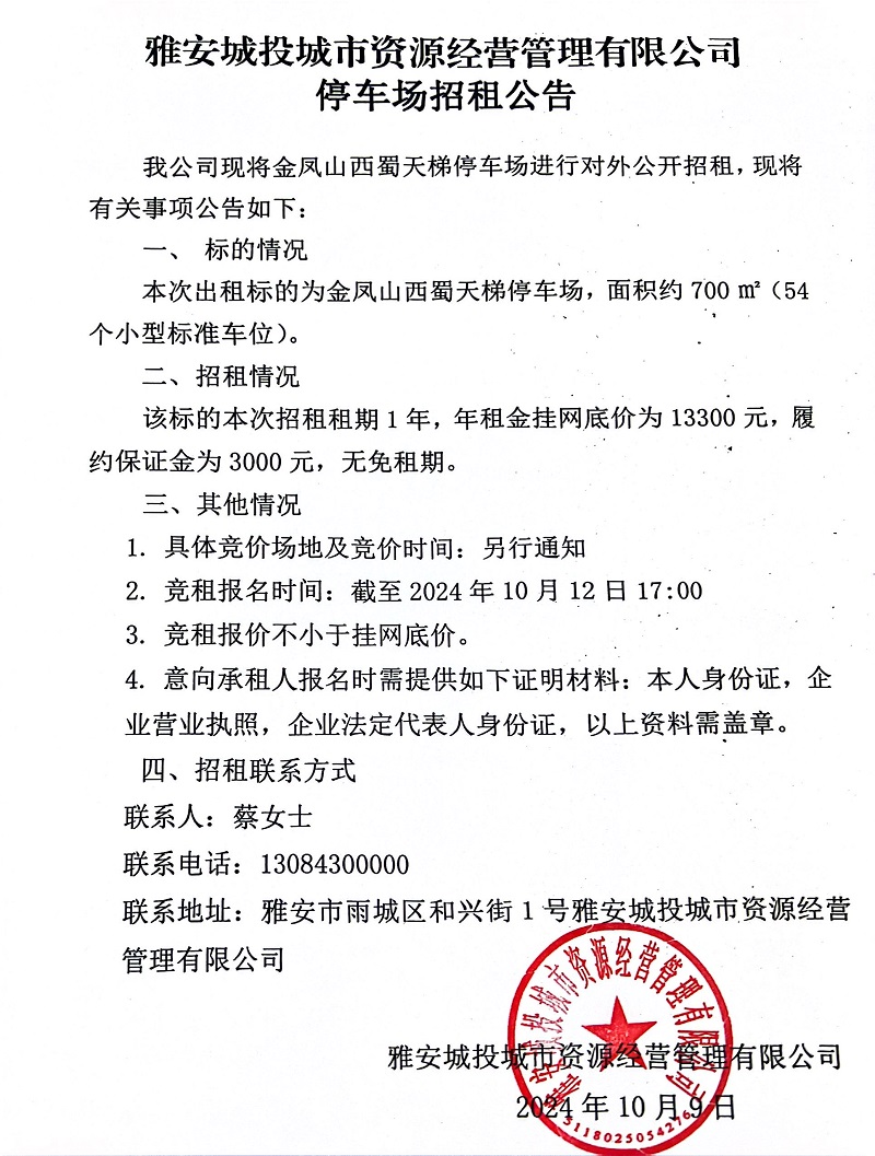 雅安城投城市資源經營管理有限公司關于金鳳山西蜀天梯停車場招租的公告