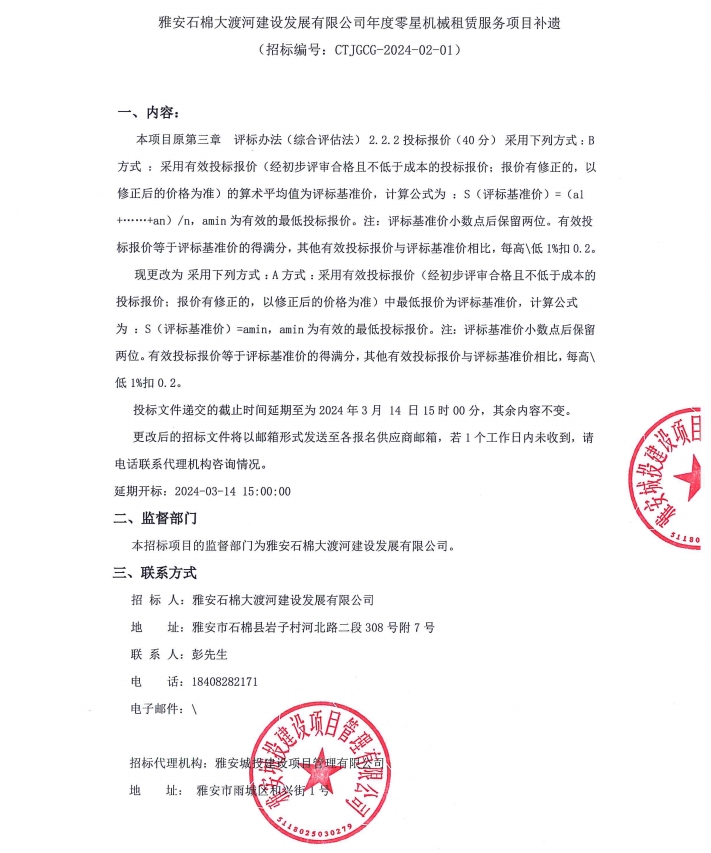 雅安石棉大渡河建設(shè)發(fā)展有限公司年度零星機械租賃服務(wù)項目補遺公告