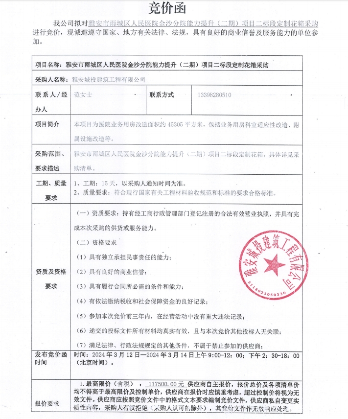 雅安市雨城區(qū)人民醫(yī)院金沙分院能力提升(二期)項目二標段定制花箱采購競價公告