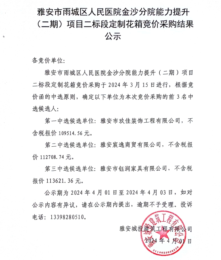 雅安市雨城區(qū)人民醫(yī)院金沙分院能力提升(二期)項目二標段定制花箱競價采購結果公示