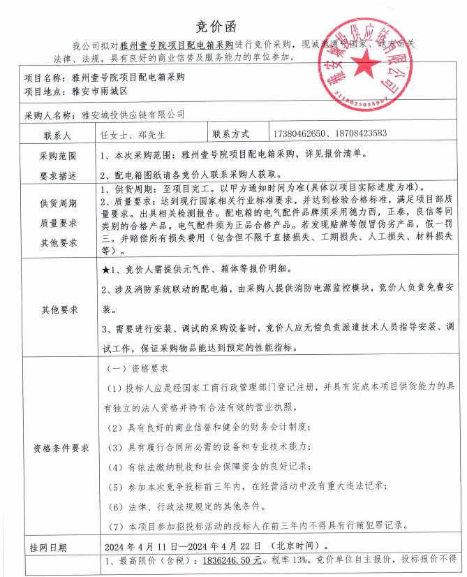 雅州壹號(hào)院項(xiàng)目配電箱采購(gòu)競(jìng)價(jià)公告