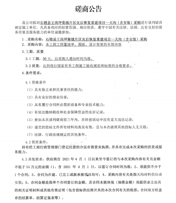 石棉縣王崗坪集鎮(zhèn)片區(qū)災后恢復重建項目--天溝(含安裝)采購談判磋商公告