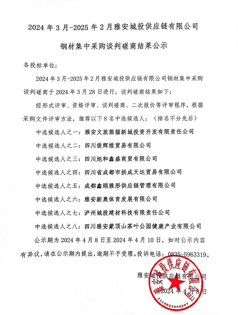 2024年3月-2025年2月雅安城投供應鏈有限公司鋼材集中采購談判磋商結(jié)果公示