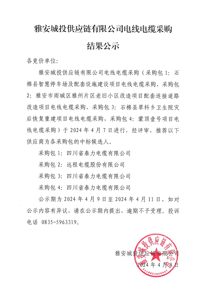 雅安城投供應(yīng)鏈有限公司電線(xiàn)電纜采購(gòu)結(jié)果公示