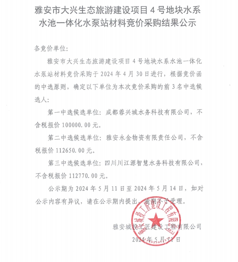 雅安市大興生態(tài)旅游建設項目4號地塊水系水池一體化水泵站材料競價采購結果公示