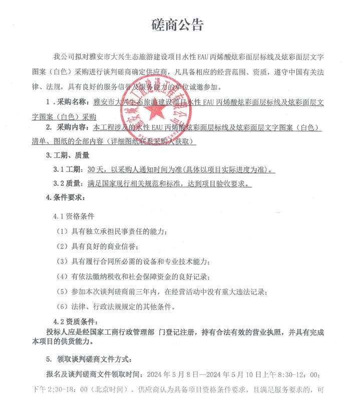 雅安市大興生態(tài)旅游建設(shè)項(xiàng)目水性EAU丙烯酸炫彩面層標(biāo)線(xiàn)及炫彩面層文字圖案(白色)采購(gòu)磋商公告