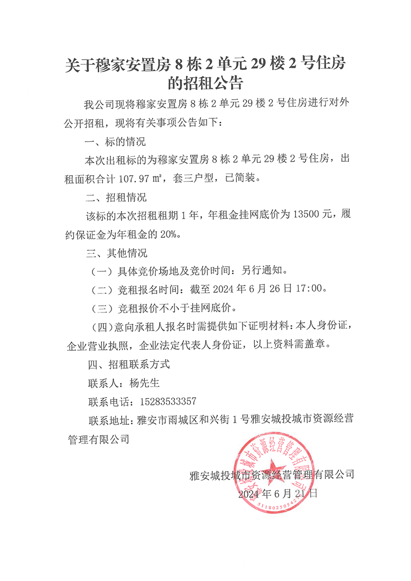 關(guān)于穆家安置房8棟2單元29樓2號(hào)住房的招租公告