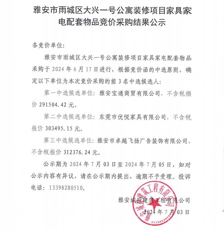 雅安市雨城區(qū)大興一號公寓裝修項(xiàng)目家具家電配套物品競價(jià)采購結(jié)果公示