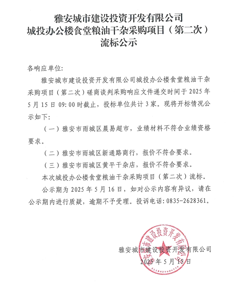 雅安城市建設(shè)投資開(kāi)發(fā)有限公司城投辦公樓食堂糧油干雜采購(gòu)項(xiàng)目(第二次)流標(biāo)公示