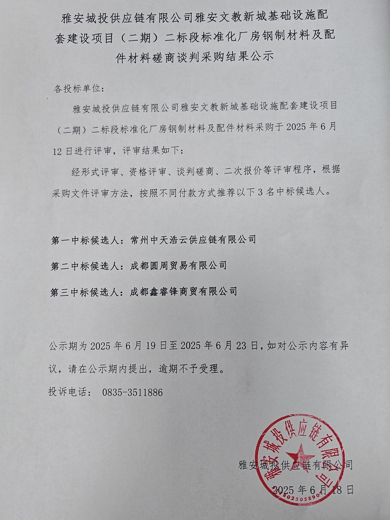 雅安城投供應(yīng)鏈有限公司雅安文教新城基礎(chǔ)設(shè)施配套建設(shè)項(xiàng)目(二期)二標(biāo)段標(biāo)準(zhǔn)化廠房鋼制材料及配件材料磋商談判采購結(jié)果公示