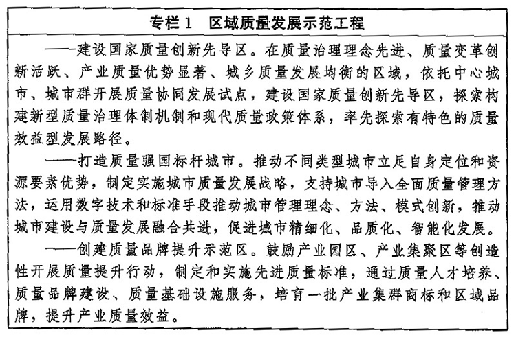 (九)打造區(qū)域質量發(fā)展新優(yōu)勢。加強質量政策引導,推動區(qū)域質量發(fā)展與生產力布局、區(qū)位優(yōu)勢、環(huán)境承載能力及社會發(fā)展需求對接融合。推動東部地區(qū)發(fā)揮質量變革創(chuàng)新的引領帶動作用,增強質量競爭新優(yōu)勢,實現整體質量提升。引導中西部地區(qū)因地制宜發(fā)展特色產業(yè),促進區(qū)域內支柱產業(yè)質量升級,培育形成質量發(fā)展比較優(yōu)勢。推動東北地區(qū)優(yōu)化質量發(fā)展環(huán)境,加快新舊動能轉換,促進產業(yè)改造升級和質量振興。健全區(qū)域質量合作互助機制,推動區(qū)域質量協(xié)同發(fā)展。深化質量強省建設,推動質量強市、質量強業(yè)向縱深發(fā)展,打造質量強國建設標桿。