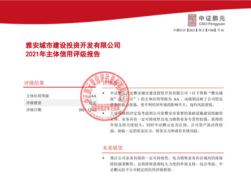 2021年12月23日,中證鵬元資信評(píng)估股份有限公司正式出具評(píng)級(jí)報(bào)告,將城投公司主體信用等級(jí)評(píng)定為AA。