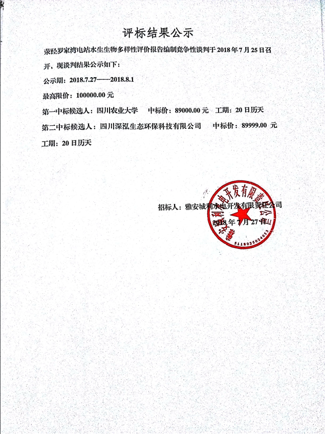滎經(jīng)羅家灣電站水生生物多樣性評價(jià)報(bào)告編制競爭性談判評標(biāo)結(jié)果公示