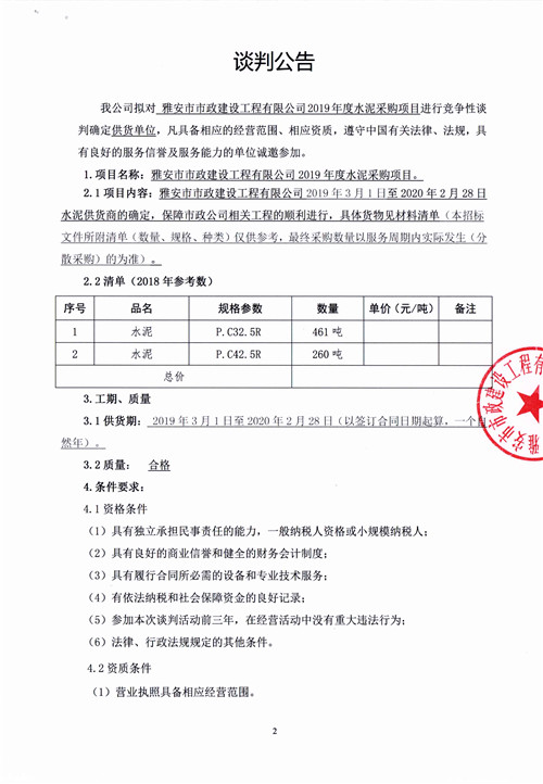 市政公司2019年度水泥采購項(xiàng)目競爭性談判公告