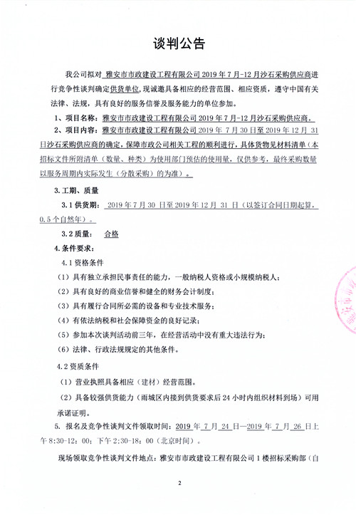 市政公司2019年7月-12月沙石采購供應(yīng)商競(jìng)爭性談判公告