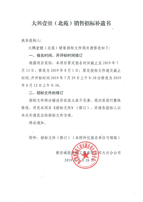 大興壹號(北苑)銷售招標補遺書