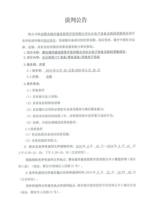 雅安城市建設(shè)投資開(kāi)發(fā)有限公司辦公電子設(shè)備及耗材采購(gòu)項(xiàng)目競(jìng)爭(zhēng)性談判公告