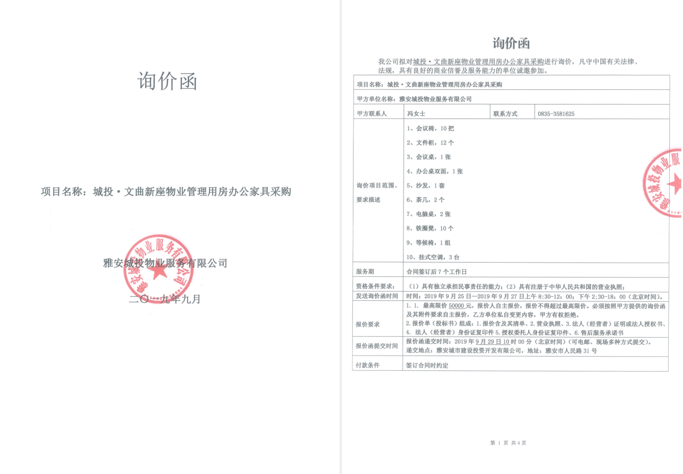 城投·文曲新座物業(yè)管理用房辦公家具采購詢價(jià)函