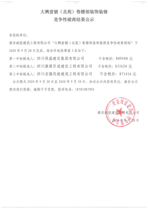 大興壹號(北苑)售樓部裝飾裝修競爭性磋商結(jié)果公示