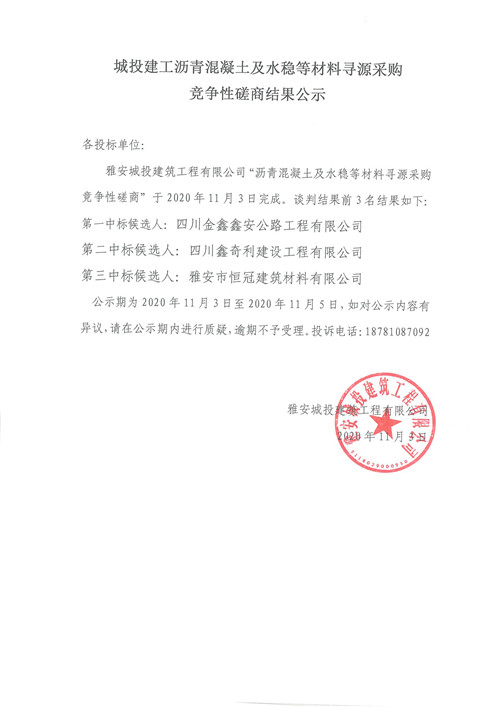 城投建工瀝青混凝土及水穩(wěn)等材料尋源采購競爭性磋商結(jié)果公示