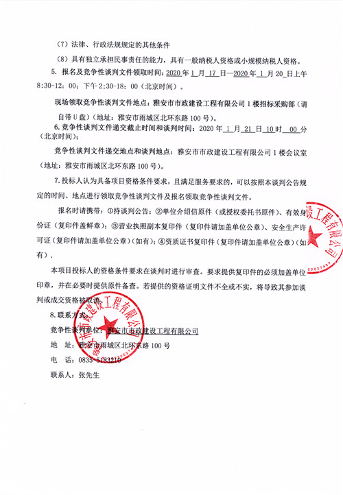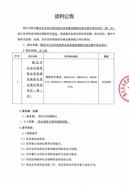 雅安市生活垃圾轉運體系建設姚橋垃圾壓縮中轉站項目確定鋼筋供貨單位的競爭性談判公告(第二次)
