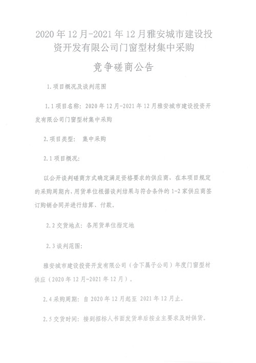 2020年12月-2021年12月雅安城市建設(shè)投資開發(fā)有限公司門窗型材集中采購競爭磋商公告