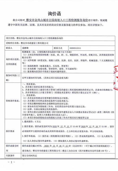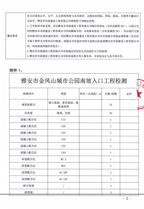 雅安市金鳳山城市公園南坡入口工程檢測服務詢價函