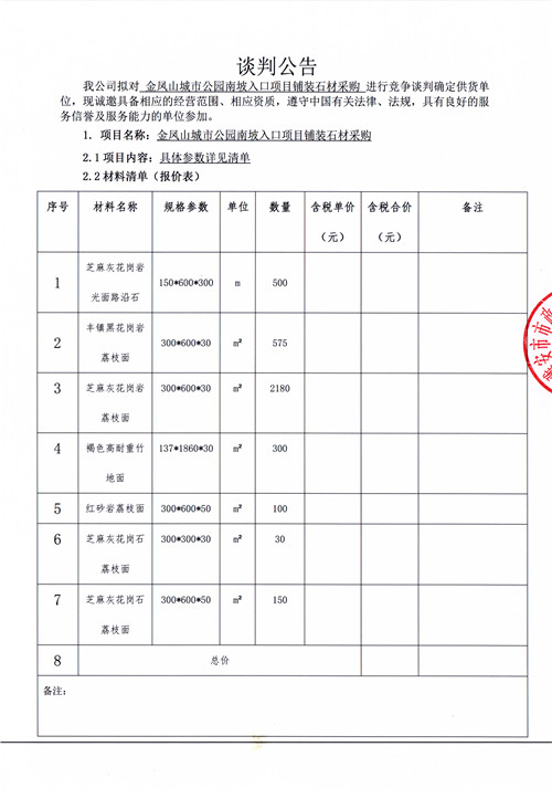 金鳳山城市公園南坡入口項(xiàng)目鋪裝石材采購(gòu)競(jìng)爭(zhēng)性談判公告