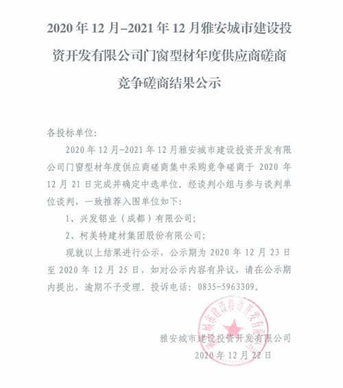 2020年12月-2021年12月雅安城市建設(shè)投資開(kāi)發(fā)有限公司門(mén)窗型材年度供應(yīng)商磋商競(jìng)爭(zhēng)磋商結(jié)果公示