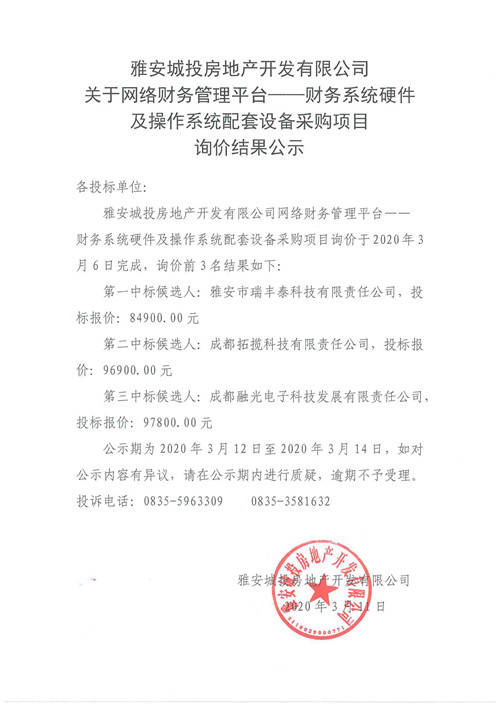 城投房地產(chǎn)公司關(guān)于網(wǎng)絡(luò)財(cái)務(wù)管理平臺(tái)——財(cái)務(wù)系統(tǒng)硬件及操作系統(tǒng)配套設(shè)備采購項(xiàng)目詢價(jià)結(jié)果公示
