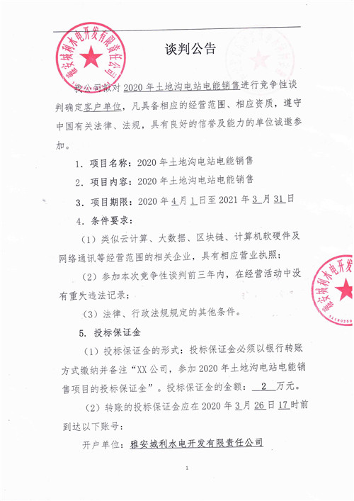 城利水電公司2020年土地溝電站電能銷售競爭性談判公告