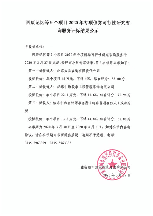 西康記憶等9個(gè)項(xiàng)目2020年專(zhuān)項(xiàng)債券可行性研究咨詢(xún)服務(wù)評(píng)標(biāo)結(jié)果公示