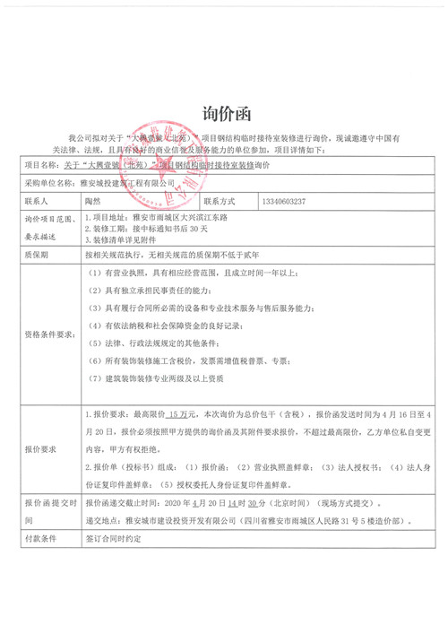 城投建工“大興壹號(北苑)”項目鋼結構臨時接待室裝修的詢價函