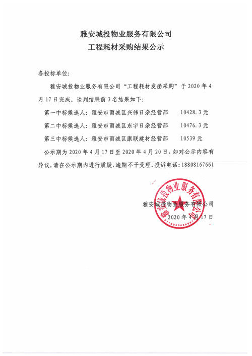 城投物業(yè)公司工程耗材采購(gòu)結(jié)果公示