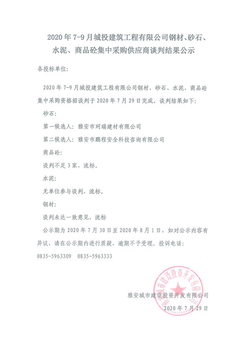2020年7月-9月城投建筑工程有限公司鋼材、砂石、水泥、商品砼集中采購供應商談判結果公示